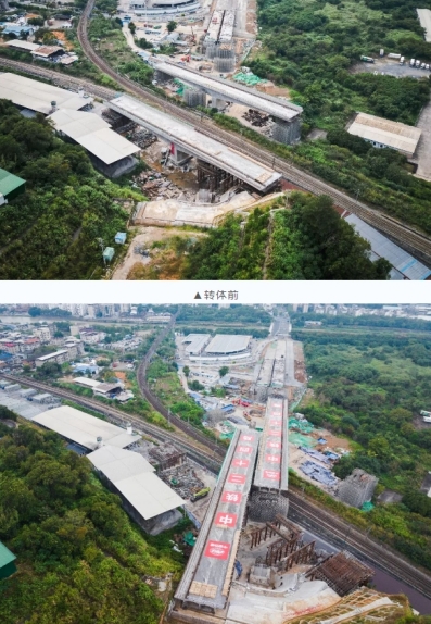 當天7時04分,轉(zhuǎn)體橋梁開始轉(zhuǎn)體,經(jīng)過44分鐘施工,成功完成高空“二人轉(zhuǎn)”,為下一步順利實現(xiàn)通車運營奠定堅實基礎(chǔ)。轉(zhuǎn)體橋上跨既有漳龍線、龍東線及煤場專用線3條鐵路貨運營業(yè)線,距離營業(yè)線最近距離僅5.9米,施工難度大,危險系數(shù)高。