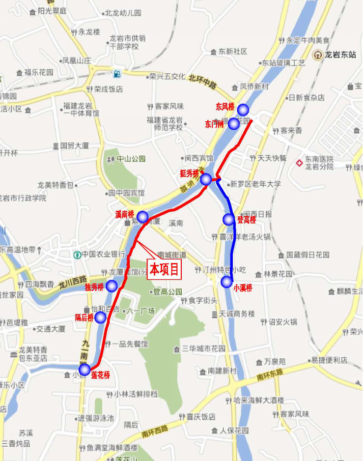 其中,沿線除東風橋、溪南橋和登高橋處采用下穿橋梁方式,其余交叉均采用平交設(shè)置斑馬線過街,工程內(nèi)容包括綠道、蘇溪河景觀平臺、隔后泉景觀節(jié)點、休憩設(shè)施、沿線綠化的改造提升、周邊機動車道的改造、沿線擋墻、圍墻、截污溝和截污井的美化提升及沿線雕塑。