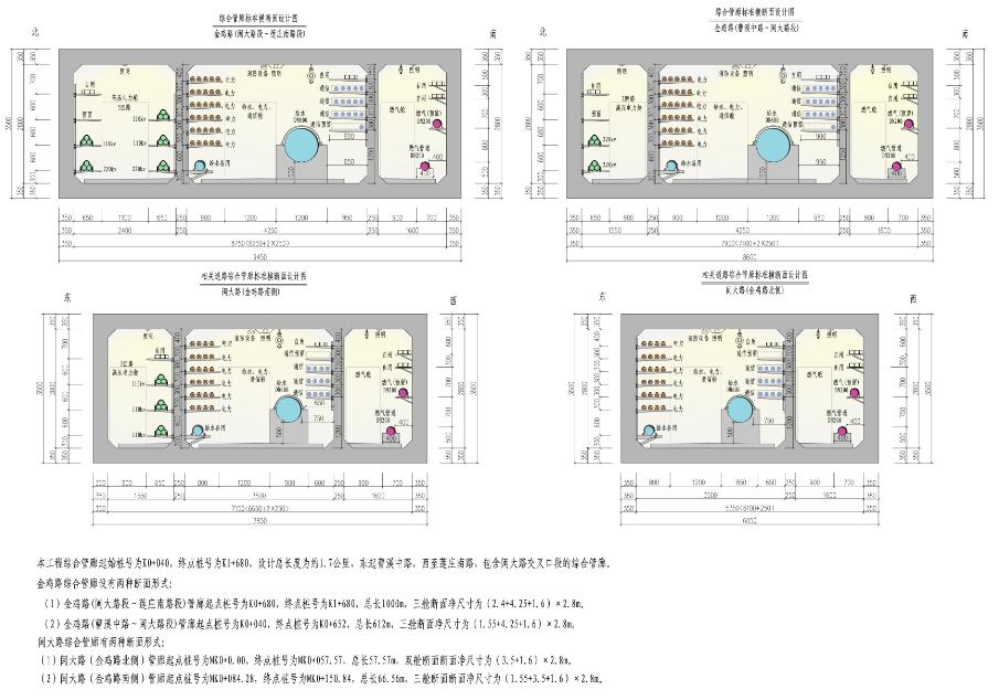 :①斷面凈尺寸為(2.4十4.25十1.6)×2.8M,艙內(nèi)管線有:給水管(管徑DN800)、通信管(16孔,含電信管、交通電纜及有線電視電纜)、電力管(30孔)、2回22KV高壓電力、3回110KV高壓電力及管廊自用電力管,并預(yù)留—定空間。②斷面凈尺寸為(1.55十4.25十1.6)×2.8M,艙內(nèi)管線有:給水管(管徑DN800)、通信管(16孔,含電信管、交通電纜及有線電視電纜)、電力管(30孔)、2回22KV高壓電力、3回110KV高壓電力及管廊自用電力管,并預(yù)留—定空間。工程總投資10500萬(wàn)元。