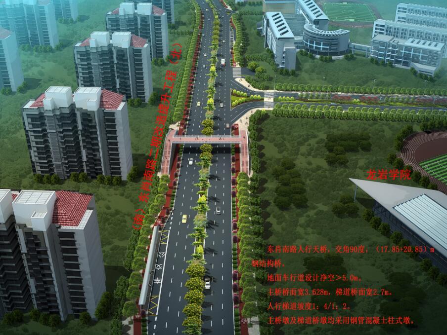 龍巖學(xué)院人行天橋位于龍巖學(xué)院大門(mén)北側(cè)約50米處,天橋采用“工”字形設(shè)計(jì),橋面長(zhǎng)40米、寬3.6米,兩側(cè)梯道坡度為1:4和1:2,跨度分別為17.85米和20.85米,寬2.7米,主橋墩及梯道橋墩均采用鋼管混凝土柱式墩,總投資約450萬(wàn)元。