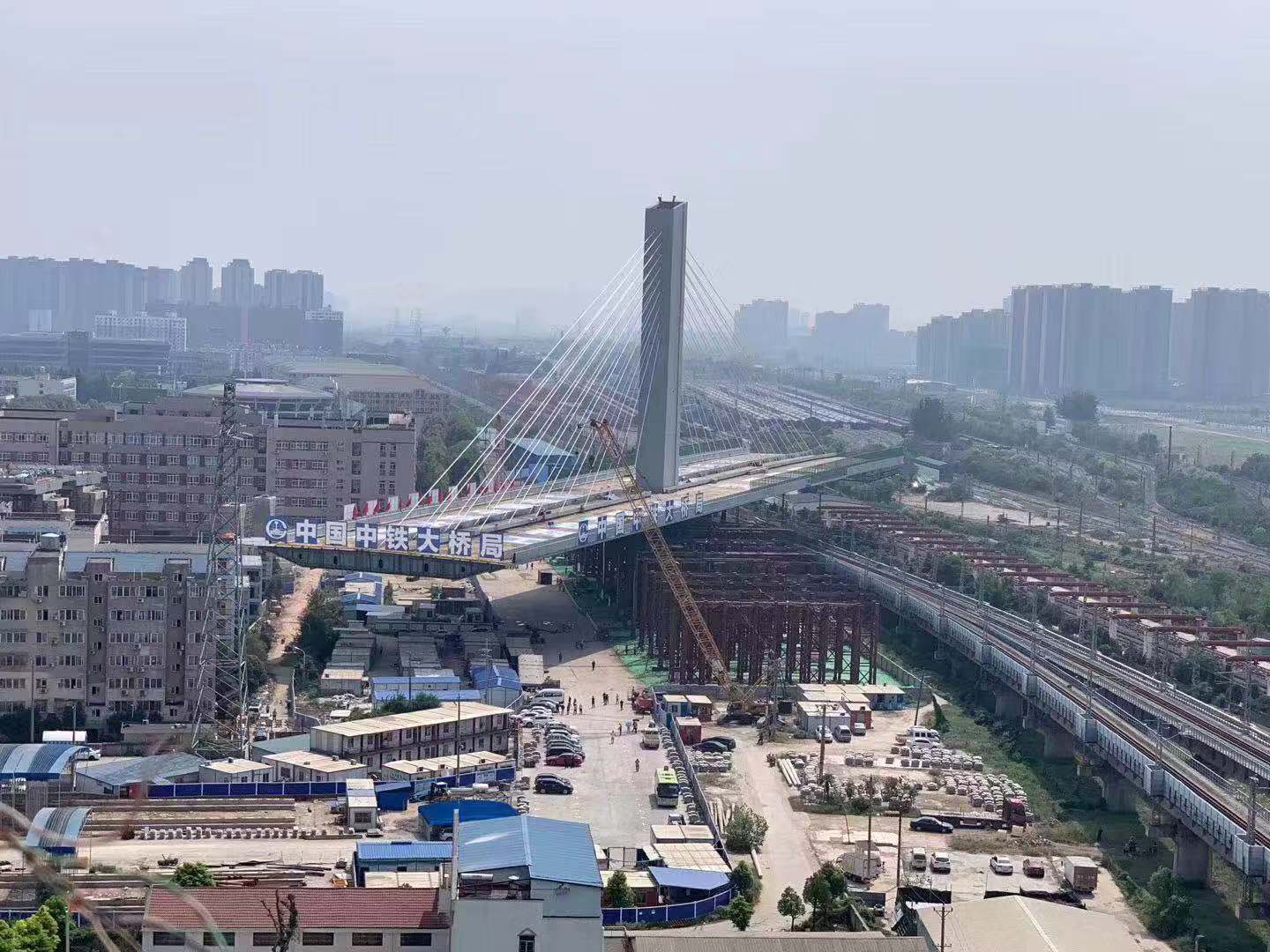 楊泗港快速通道青菱段是楊泗港長(zhǎng)江大橋武昌接線,西起八坦立交,東至丁字橋路附近,全長(zhǎng)4.46公里。因跨越繁忙的鐵路線,該項(xiàng)目采取鋼箱梁轉(zhuǎn)體施工法,即先在平行于鐵路的方向?qū)摿杭芎茫?span>“窗點(diǎn)實(shí)施高空轉(zhuǎn)體,使橋梁跨過鐵路施工難度極大。