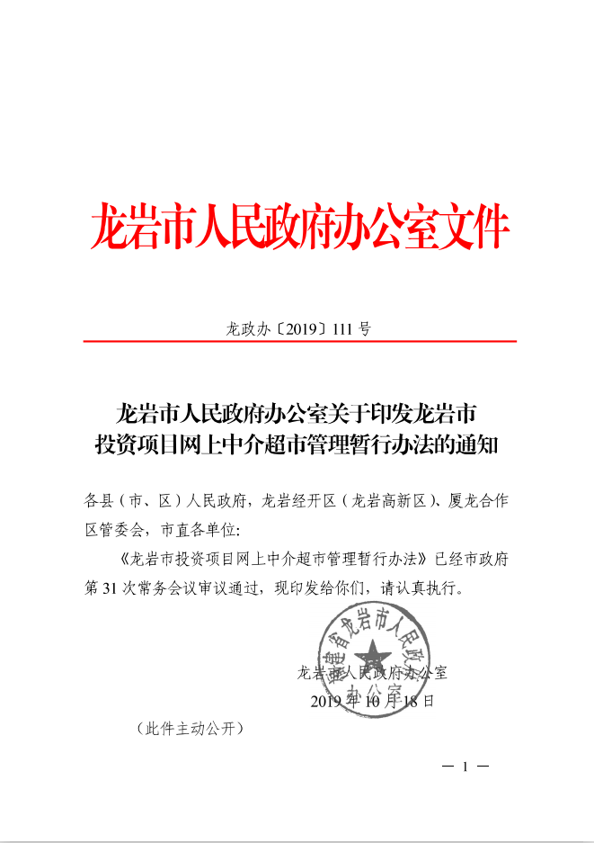 龍巖市人民政府辦公室關(guān)于印發(fā)龍巖市投資項(xiàng)目網(wǎng)上中介超市管理暫行辦法的通知(龍政辦[2019]111號)